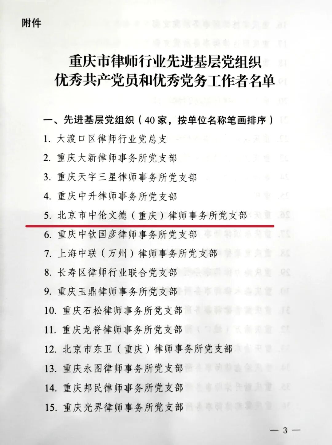 为进一步发挥先进典型示范带动作用,激励全市律师行业各级党组织和广大党员进一步发挥战斗堡垒、先锋模范作用,更好地服务保障现代化新重庆建设,重庆市律师行业党委对全市律师行业先进基层党组织进行了表彰。北京市中伦文德(重庆)律师事务所党支部荣获重庆市律师行业“先进基层党组织”荣誉称号。