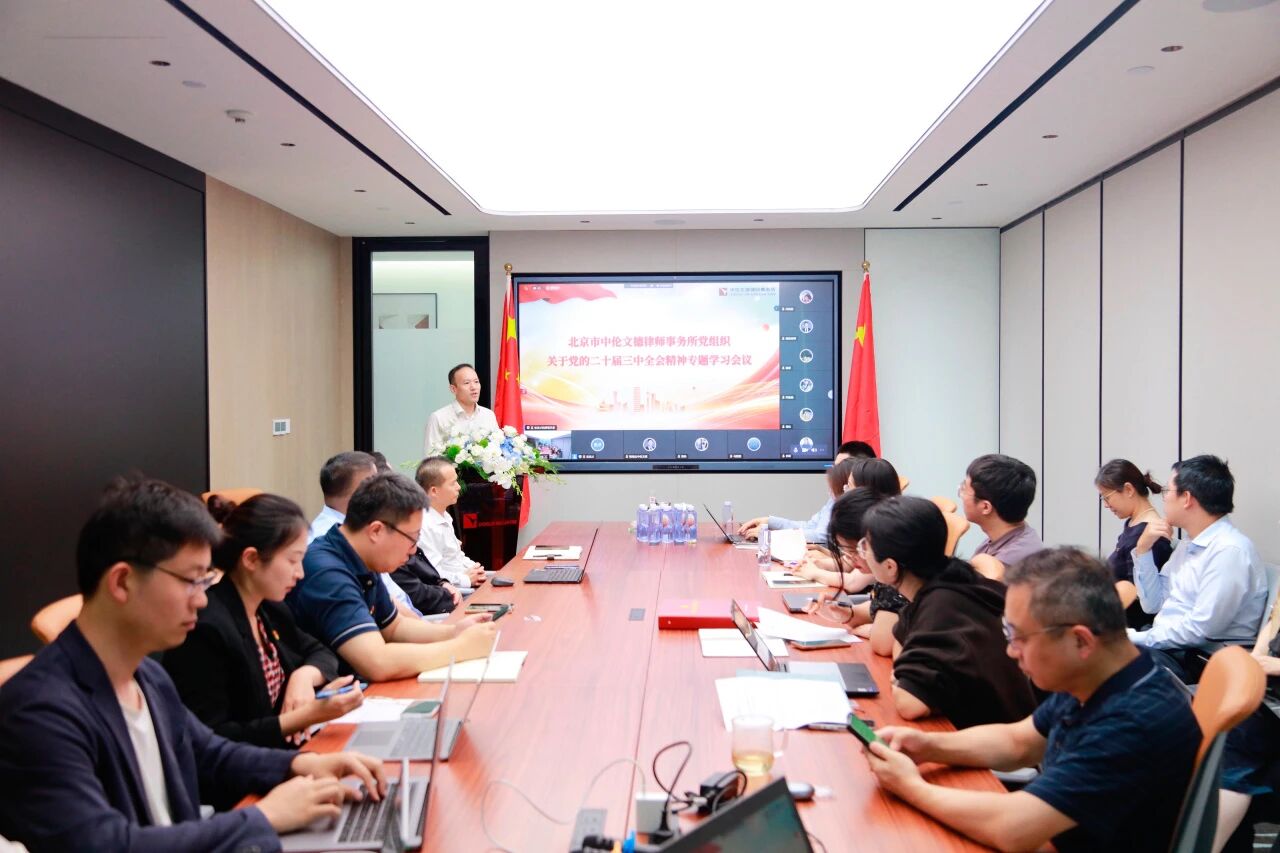 会议上,李敏副主任作为会议召集人,首先作主题发言。李律师强调这次会议,不仅是我们党在新时代新征程上的一次重要会议,更是对我们每一位法律工作者提出了新的要求和期望。作为律师,我们肩负着维护社会公平正义、促进法治建设的重任,因此,深入学习领会二十届三中全会精神,对于我们来说,具有极其重要的意义。作为一名律师,我们要深刻理解二十届三中全会的历史意义,准确把握二十届三中全会的精神实质。在谈及如何践行二十届三中全会精神时,李律师强调,党员律师要不断加强自身学习,提高政治素养;要立足岗位,发挥先锋模范作用。李律师最后表示,学习贯彻二十届三中全会精神是一项长期而艰巨的任务。我们中伦文德律师事务所全体党员要始终保持昂扬向上的精神状态和奋发有为的工作作风,不断将学习成果转化为推动律师行业高质量发展的实际行动,为实现中华民族伟大复兴的中国梦贡献自己的全部力量!