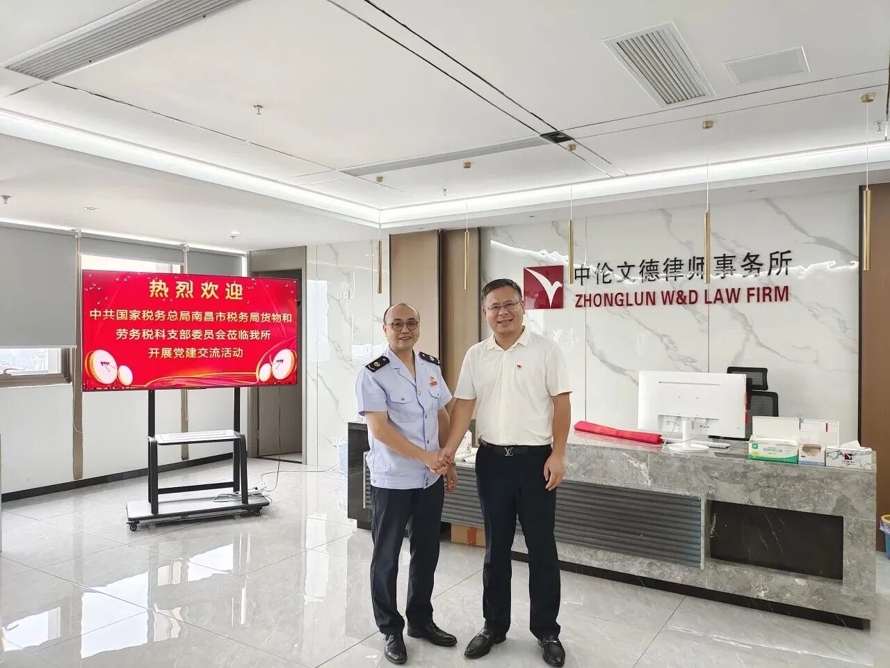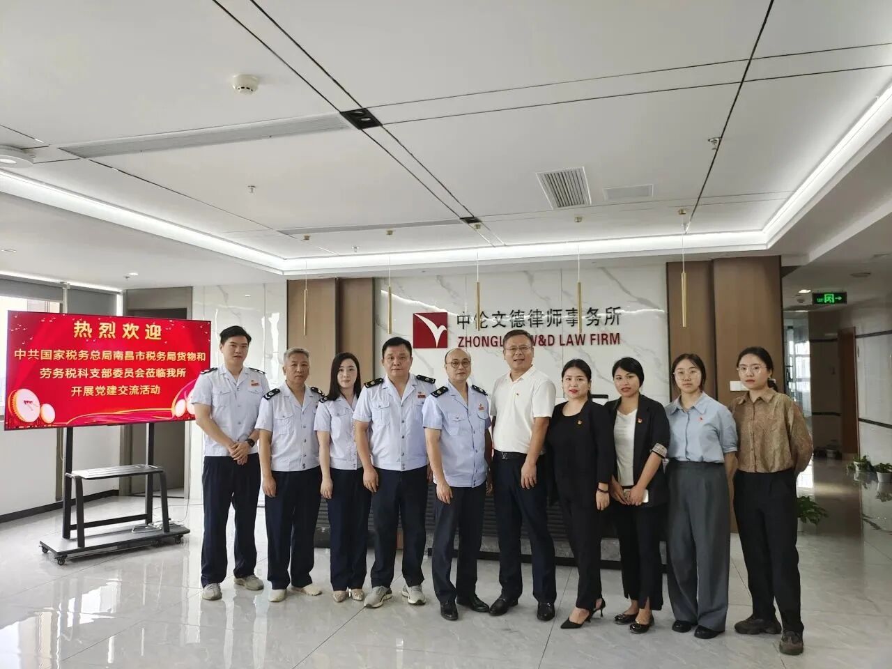 2023年7月31日,中共国家税务总局南昌市税务局货物和劳务税科支部委员会一行莅临北京市中伦文德(南昌)律师事务所开展党建交流活动。