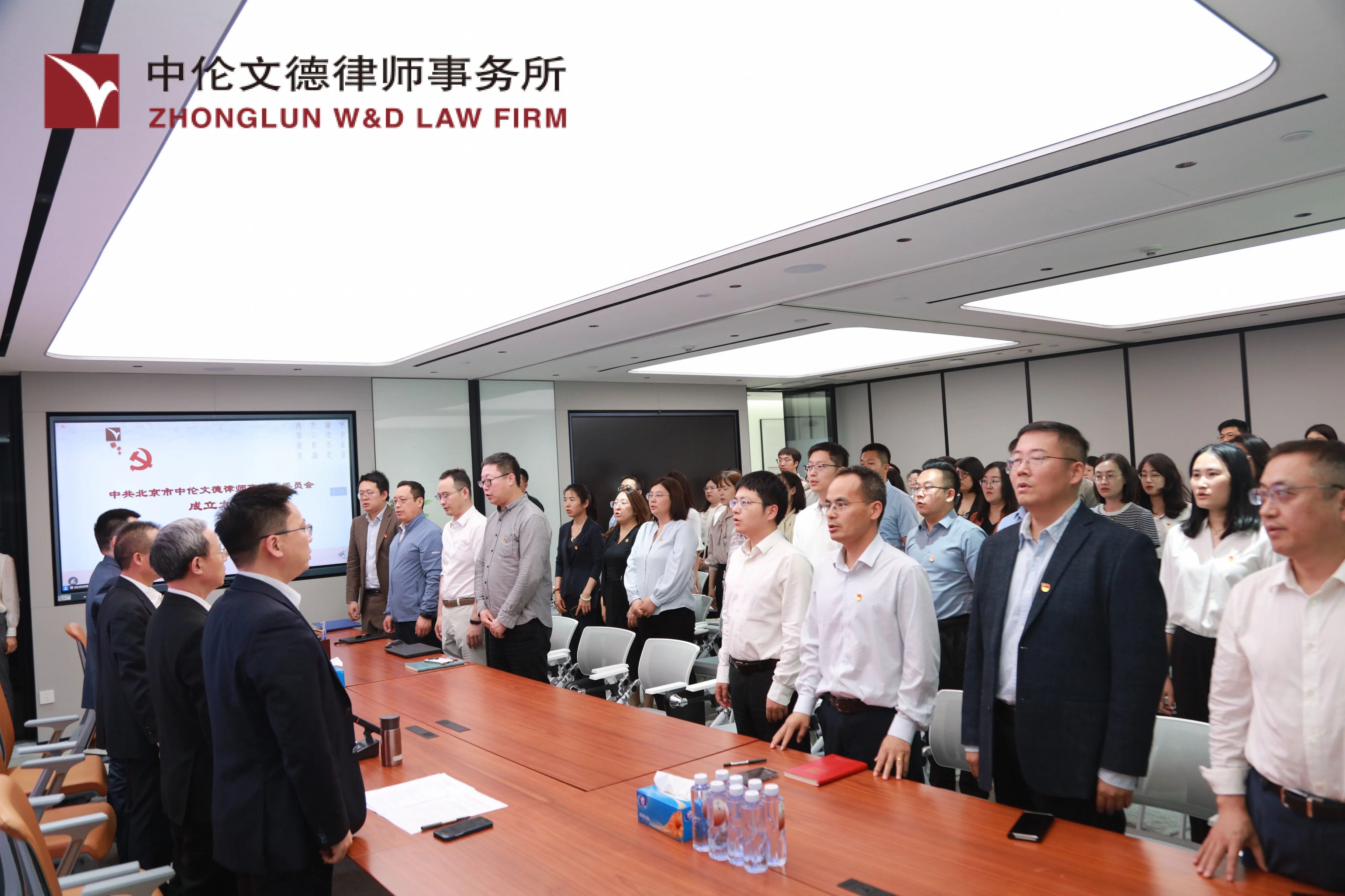 北京市中伦文德律师事务所主任夏欲钦同志、执委会主任李敏同志、执委李政明同志、执委胡高崇同志及全体党员参加了2025年5月21日的党委成立大会,会议由高级合伙人方登发同志主持。会议在庄严肃穆的氛围中拉开帷幕。全体起立,奏国歌。
