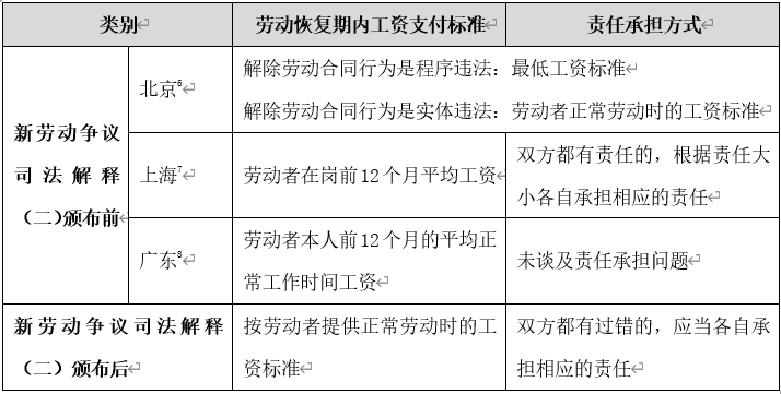 新劳动争议司法解释(二)颁布前,各地关于劳动恢复期内的工资支付标准及责任承担的规定存在差异。新劳动争议司法解释(二)颁布后,就劳动合同解除或终止争议期间内的工资支付标准和责任的承担进行规定,解决了以往司法实践中支付工资标准不明的问题。新劳动争议司法解释(二)颁布前后的规定具体如下: