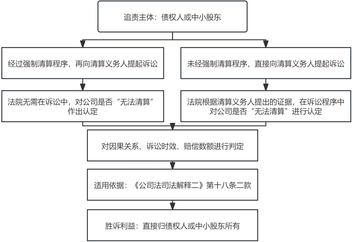除此之外,债权人或中小股东亦可以通过先申请强制清算,待法院作出无法清算的结论终结强制清算程序后,再据此向清算义务人主张权利。届时,法院无需在诉讼程序中对公司能否清算的事实进行审查,从而只需从因果关系、损失数额、诉讼时效等方面进行判断即可,极大程度提高诉讼效率。