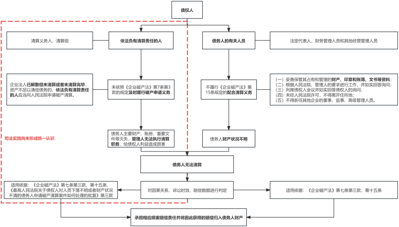 以上种种,便导致解散清算(包括自主清算和强制清算)、破产清算案件中,清算义务人的责任界定以及归责路径上留下了诸多有待探讨的问题。
