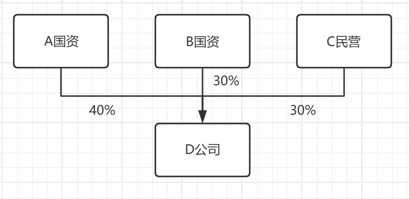 A与B公司均为国资合计持股比例超过50%,且A为最大股东,因此D公司属于国有控股公司。但下图中: