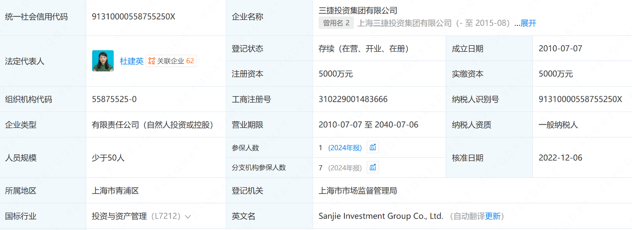 三捷系的最上层法律主体应为“三捷投资集团有限公司”(简称“三捷集团”),其基本信息如下: