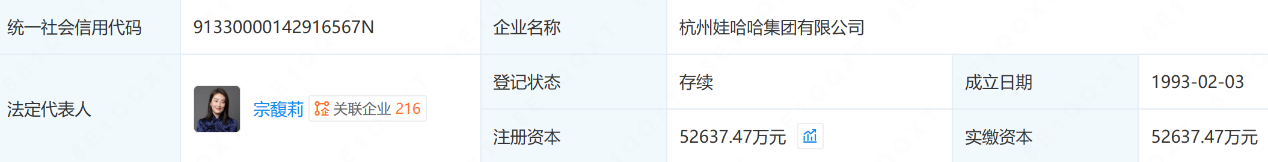 娃哈哈最上层公司的全称为“杭州娃哈哈集团有限公司” (简称“娃哈哈集团”)。打开企查查,娃哈哈集团的基本信息如下: