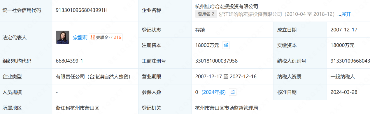 “宏振系”的最上层法律主体为“杭州娃哈哈宏振投资有限公司”(简称“宏振投资”),其基本信息如下:
