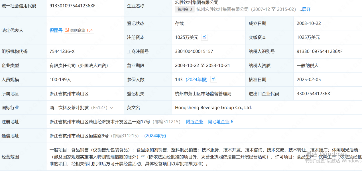 企查查显示,宗馥莉担任宏胜集团的董事(唯一一位董事),祝丽丹(企查查显示目前担任164家企业的法定代表人/经理/负责人/财务负责人/监事)担任法定代表人兼总经理。