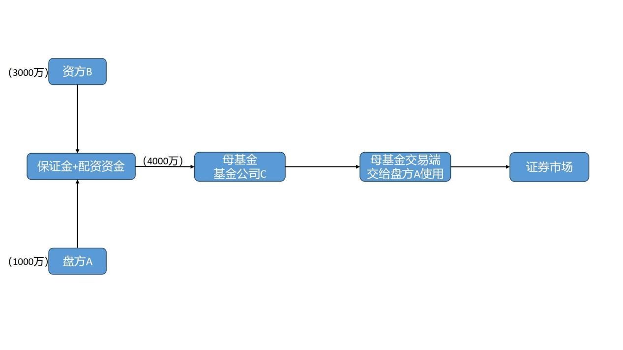 盘方A提供1000万元保证金投入资方B母基金,资方B提供2000万元母基金(1:1),投入C管理的子基金,子基金再下投至盘方A控制的子基金。盘方A每月向C支付利息。