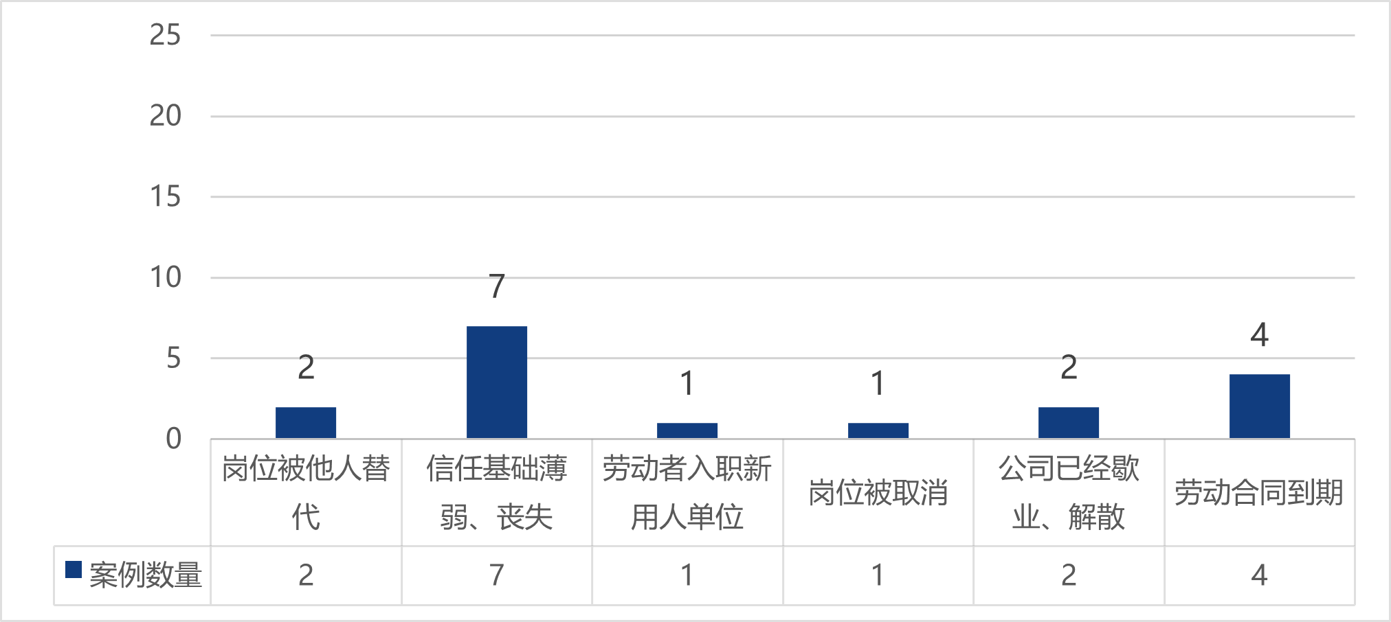 在判决时间为2023年1月至2024年12月期间的案例中,北京法院未支持劳动者继续履行劳动合同请求的案例有17件。对这些案例涉及的裁判理由加以统计后发现,法院认定劳动合同“不能继续履行”的理由分布如下: