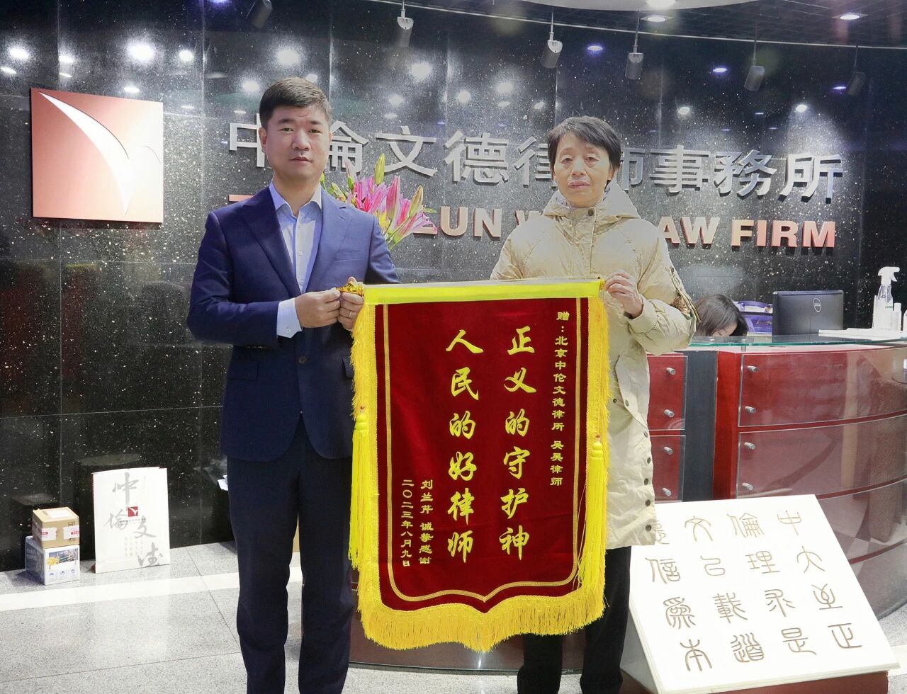 2023年11月13日,北京市中伦文德律师事务所合伙人吴昊律师收到客户送来的一面锦旗,上面写着:“正义的守护神、人民的好律师”。简短十二字,彰显出真情与赞许,也承载着委托人对北京市中伦文德律师事务所的肯定和认可。