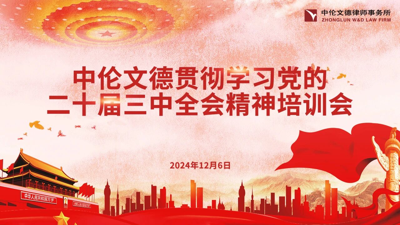 为深入学习贯彻习近平总书记关于全面深化改革的一系列新思想、新观点、新论断和党的二十届三中全会精神,引导广大党员律师不断提升业务能力和服务水平,为推动法治中国建设贡献智慧和力量。2024年12月6日,北京市中伦文德律师事务所再次成功举办贯彻学习党的二十届三中全会精神培训会,全体党员通过线下线上相结合的方式参加了本次培训。