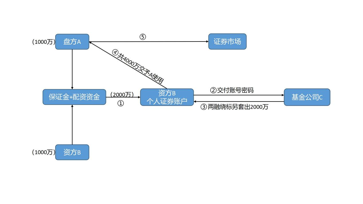 盘方A提供1000万元保证金,资方B提供1000万元资金,C按照1:1:2杠杆比例通过两融绕标模式为盘方A提供配资,配资金额共计4000万元。具体为,资方B出借其个人证券账户,盘方A将保证金打入资方B的银行账户后,资方B结合自有资金将2000万元银证转账至B证券账户,资方B将账号密码告知C,C通过两融绕标(1:1)形成总资产4000万元的资方B证券账户交付盘方A使用。证券公司两融利息约为5%,盘方A与C约定资金使用利息为9%,盘方A每月向C支付利息。