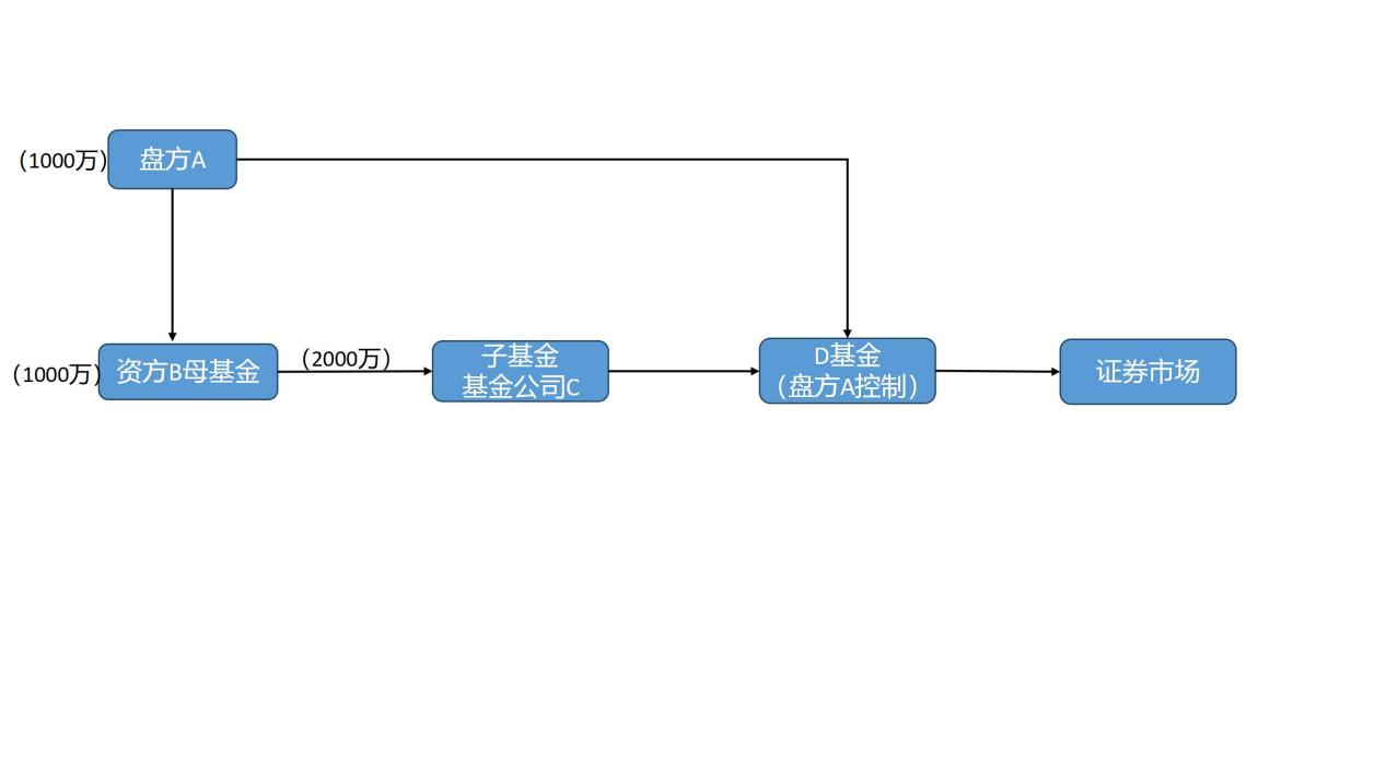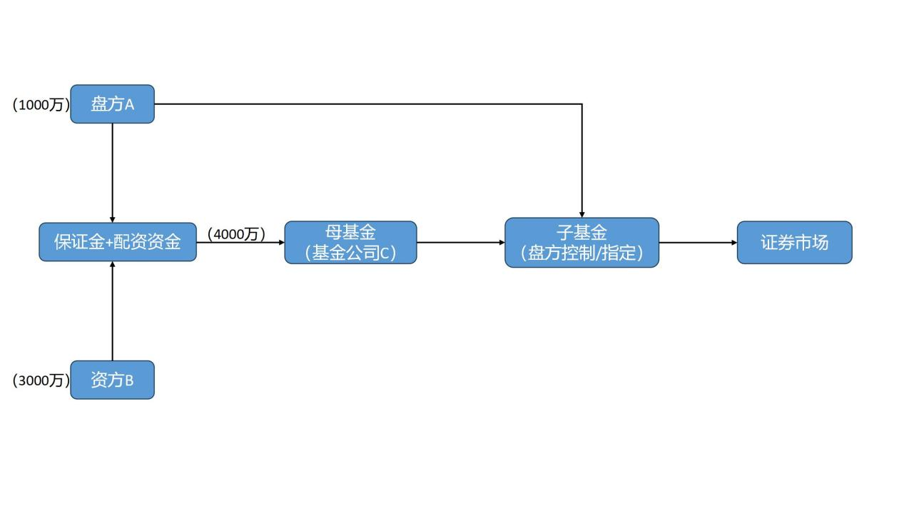 盘方A提供1000万元保证金投入资方B母基金,资方B提供2000万元母基金(1:1),投入C管理的子基金,子基金再下投至盘方A控制的子基金。盘方A每月向C支付利息。