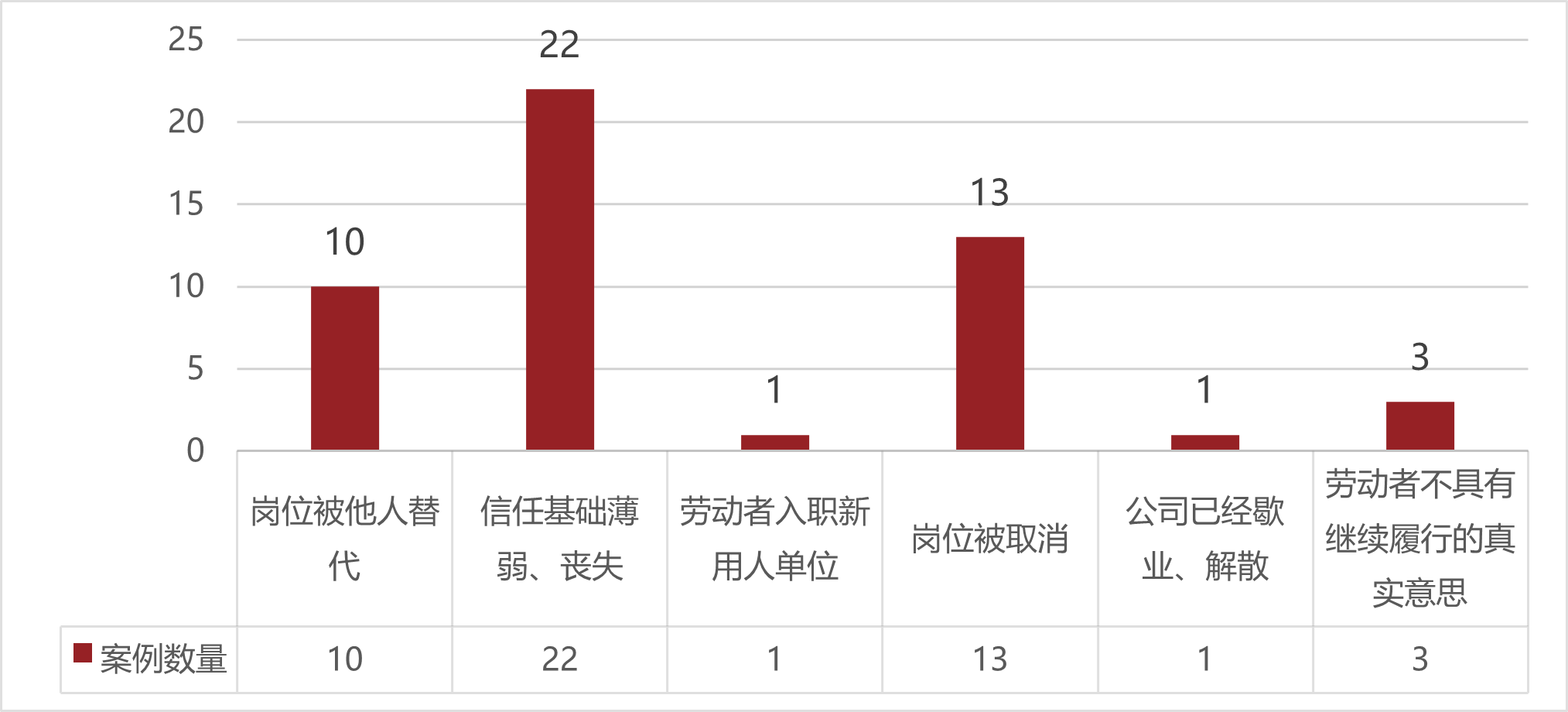 在判决时间为2023年1月至2024年12月期间的案例中,北京法院未支持劳动者继续履行劳动合同请求的案例有17件。对这些案例涉及的裁判理由加以统计后发现,法院认定劳动合同“不能继续履行”的理由分布如下: