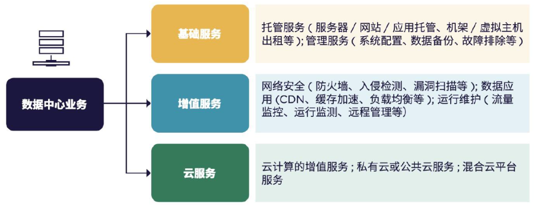 按运营主体分 | 基础电信运营商 | 如中国电信、中国联通、中国移动、日本NTT等电信运营商,拥有核心网络资源、 充足的带宽资源以及遍布全国的机房 |